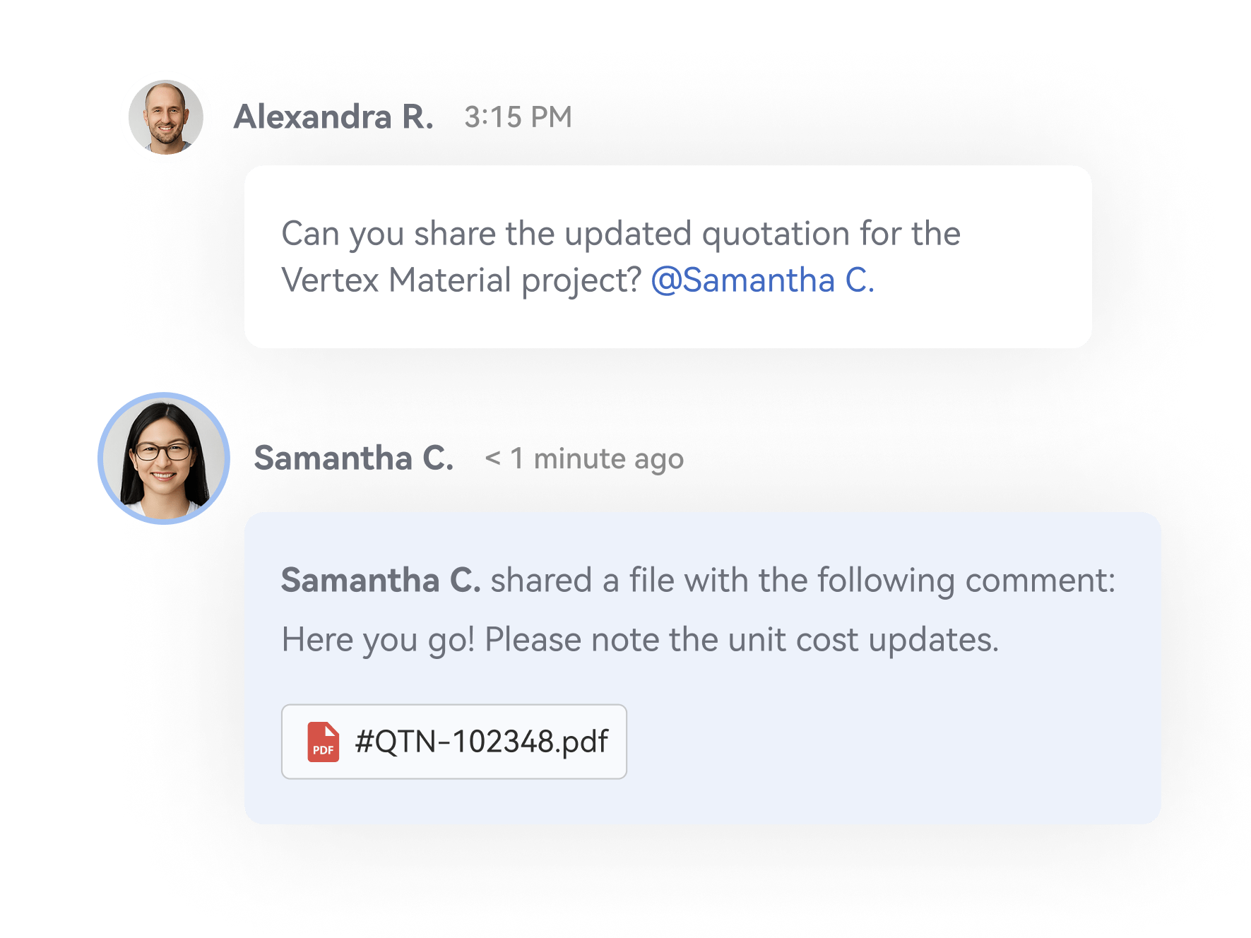 Tag teammates, share files, and keep conversations organized—no more scattered chats or missed updates.